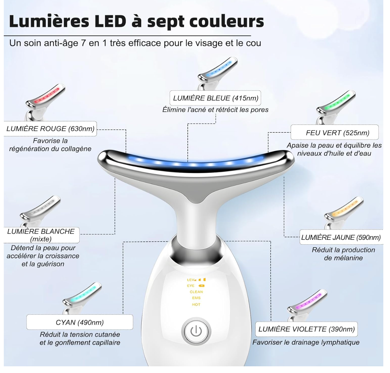 Cet appareil de massage visage & cou associe EMS , chaleur douce et micro-vibrations pour aider à détendre les zones tendues, améliorer l'apparence de la peau et sublimer le teint — sans douleur et depuis chez vous .